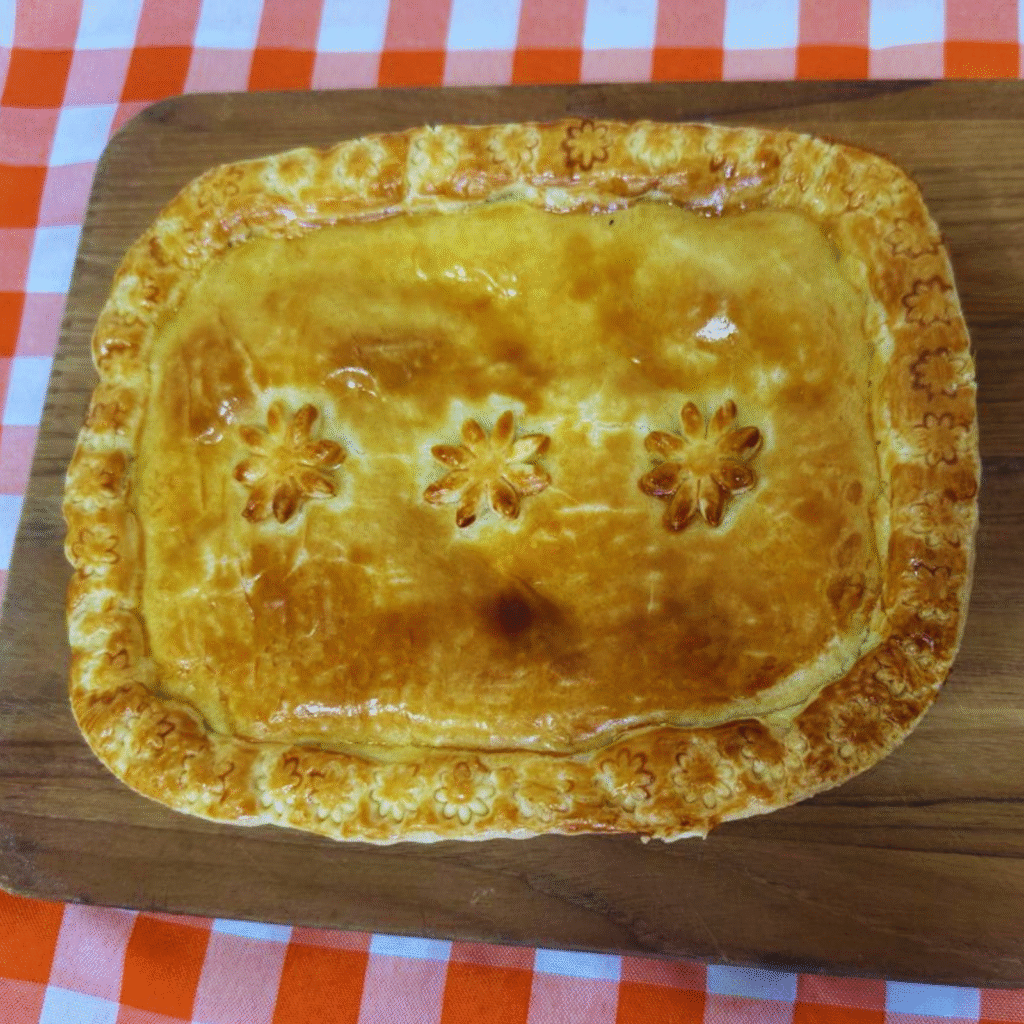 Massa quebradiça recheada com frango ao molho vermelho, palmito, bacon e uma cobertura cremosa.